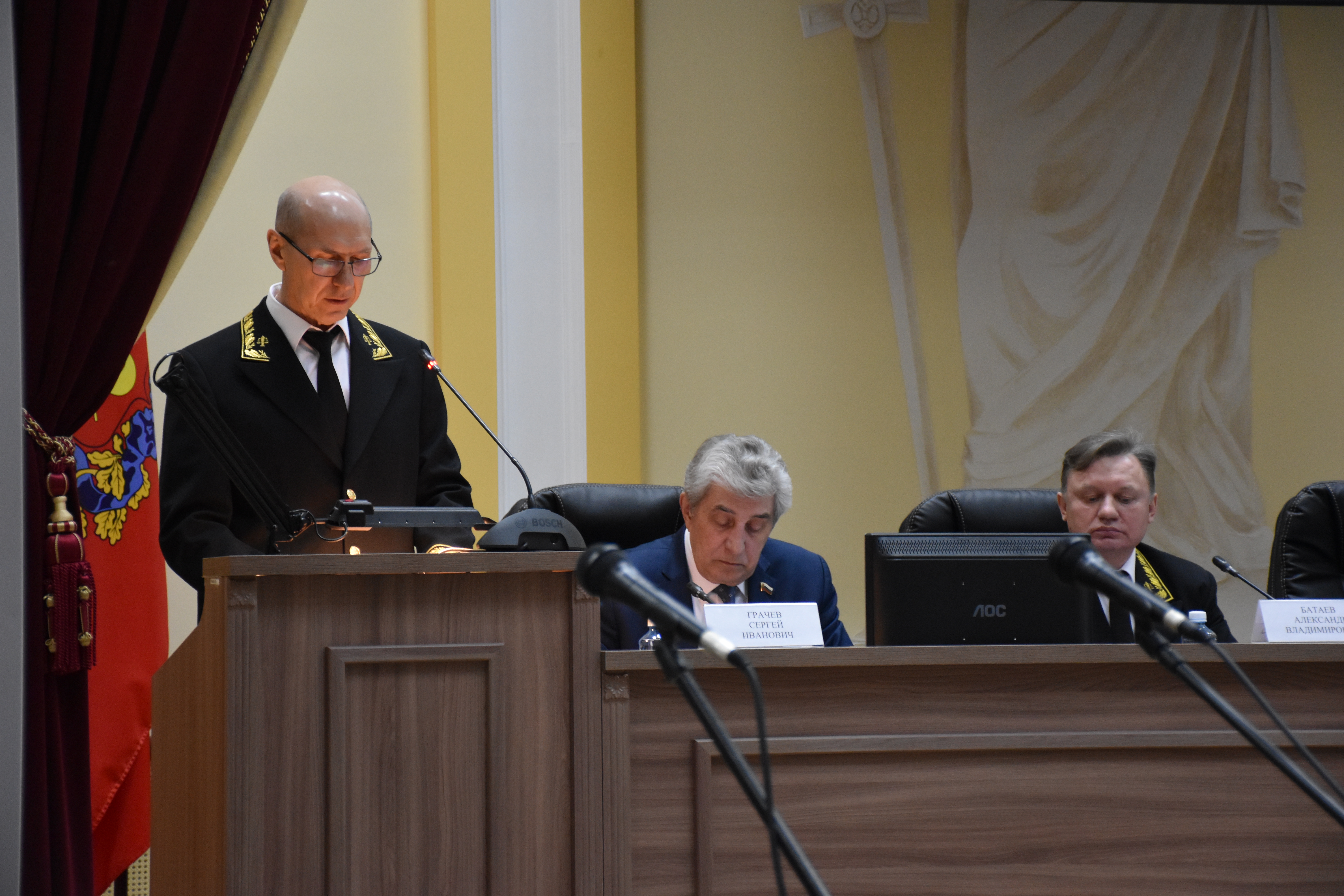 Открыл совещание председатель Оренбургского областного суда В.М. Ушаков. Поприветствовав всех участников мероприятия, Владимир Михайлович подвел итоги отправления правосудия в области в ушедшем году. В своем выступлении он отметил, что в 2025 году судами области было рассмотрено 477 000 дел, в 2024 году – 693 000 дел. Таким образом, по итогам 2025 года наблюдается снижение общего количества рассмотренных дел на 31%. При этом данная тенденция отмечается в судах на всей территории Российской Федерации.