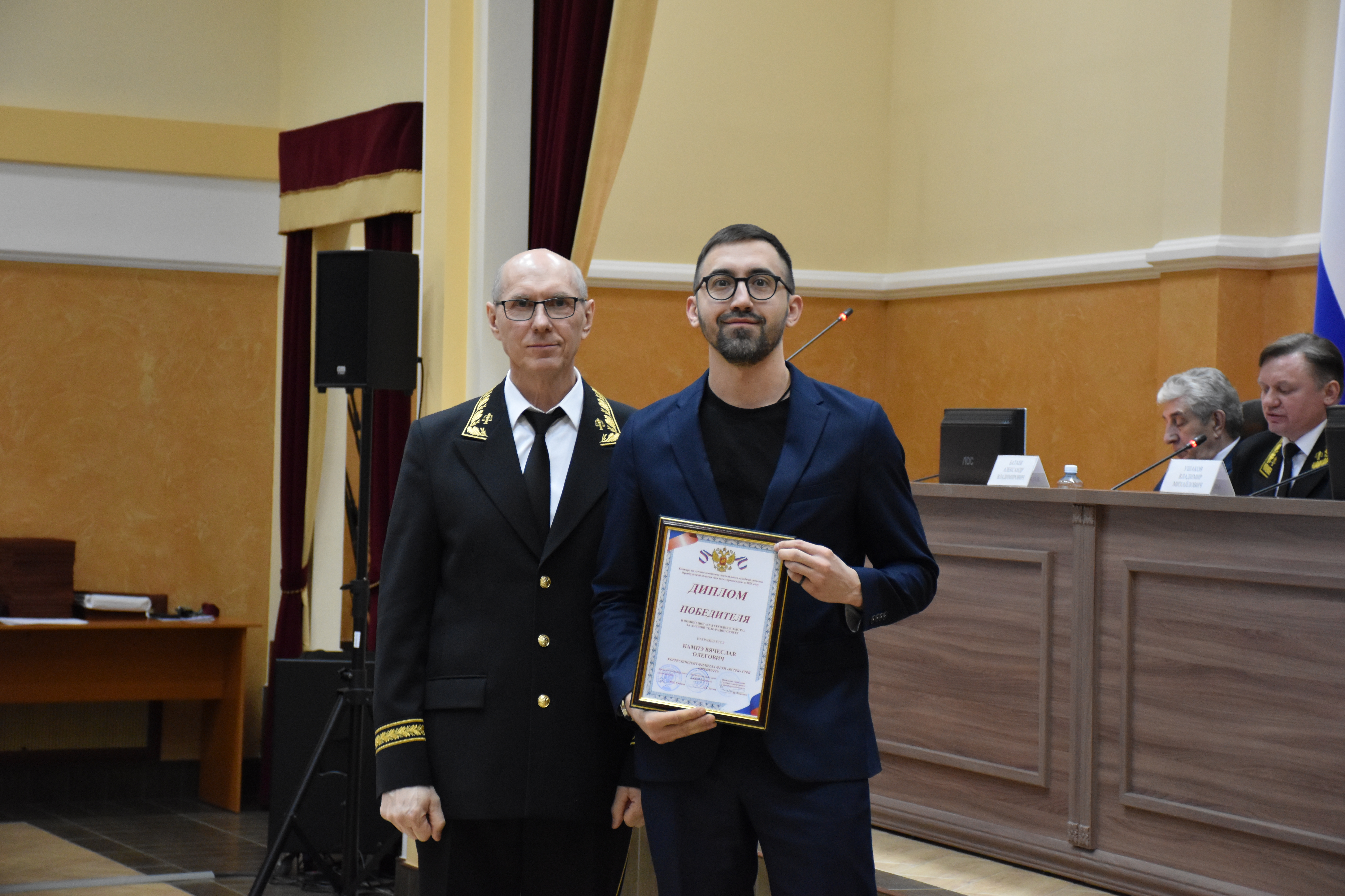 В номинации «Суд сегодня и завтра»: Лучший теле-радио сюжет – Кампэ Вячеслав Олегович, корреспондент филиала ФГУП «ВГТРК» ГТРК «Оренбург» за авторский материал «Самбурский уголовное дело»; ![]() Лучшая публикация в печатном издании – Пичурин Антон Сергеевич, редактор отдела права АНО «Редакция газеты «Оренбуржье» за авторский материал «Ставок больше не будет!»; Лучший материал в электронных средствах массовой информации – Вълкова Наталия Валентиновна, редактор сетевого издания РИА «Европейско-Азиатские Новости» в Оренбурге за авторские материалы по освещению судебного процесса по уголовному делу в отношении Самбурского А.М. В номинации «Вехи истории»: Лучший материал в электронных средствах массовой информации – Лещенко Павел Алексеевич, главный редактор интернет-издания 1743.ru за авторский материал «Оренбургский ретро-детектив: истязание крестьянки или узница Ак-Булакской волости». В номинации «Личность»: Лучшая публикация в печатном издании – Ершова Наталья Вячеславовна, главный редактор печатного издания газеты «Бугурусланские ведомости» за авторский материал «Взгляд сквозь время»; Лучший материал в электронных средствах массовой информации – Толоконникова Лидия Андреевна, шеф редактор интернет-издания «ПроОрен» за авторский материал «За кулисами правосудия: зампред Ленинского суда Оренбурга – о громких делах, работе суда и справедливости». ![]()